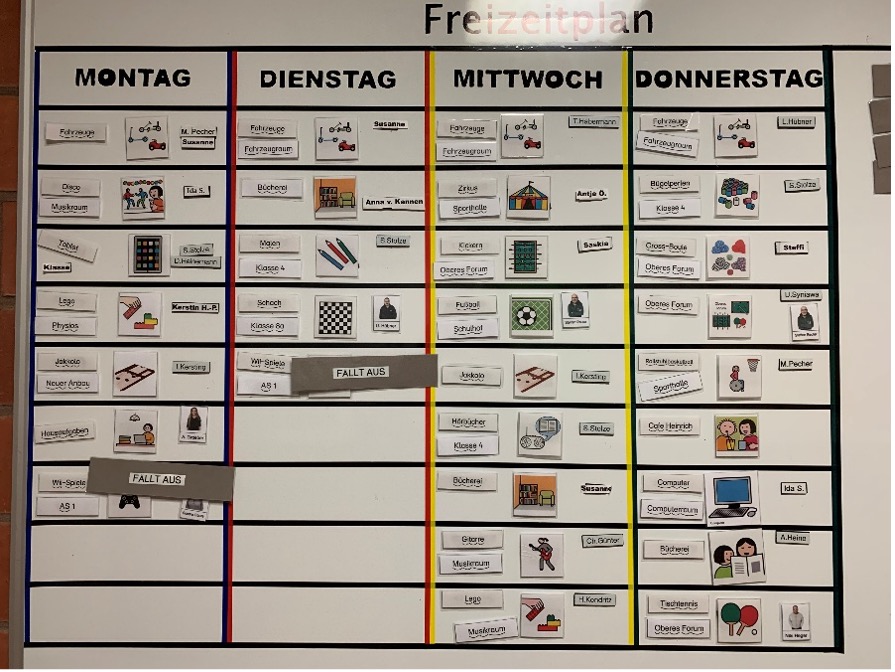 Über die Stundentafel hinaus können die Schüler und Schülerinnen ihren Bewegungsdrang in den Freizeiten und Arbeitsgemeinschaften befriedigen. Hier handelt es sich um lockere Angebote (Freizeit nach dem Mittagessen), die jede Woche neu gewählt werden können. Das Bewegungsangebot der Freizeiten erstreckt sich vom Fahrzeuge-Fahren über Fußball und Rollstuhl-Basketball zum Klettern am Gerüst der benachbarten IGS und dem Polybat, einer Mischung aus Tischtennis und Airhockey .