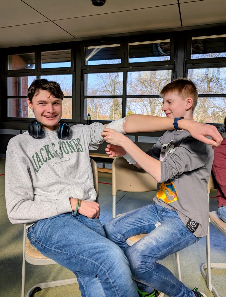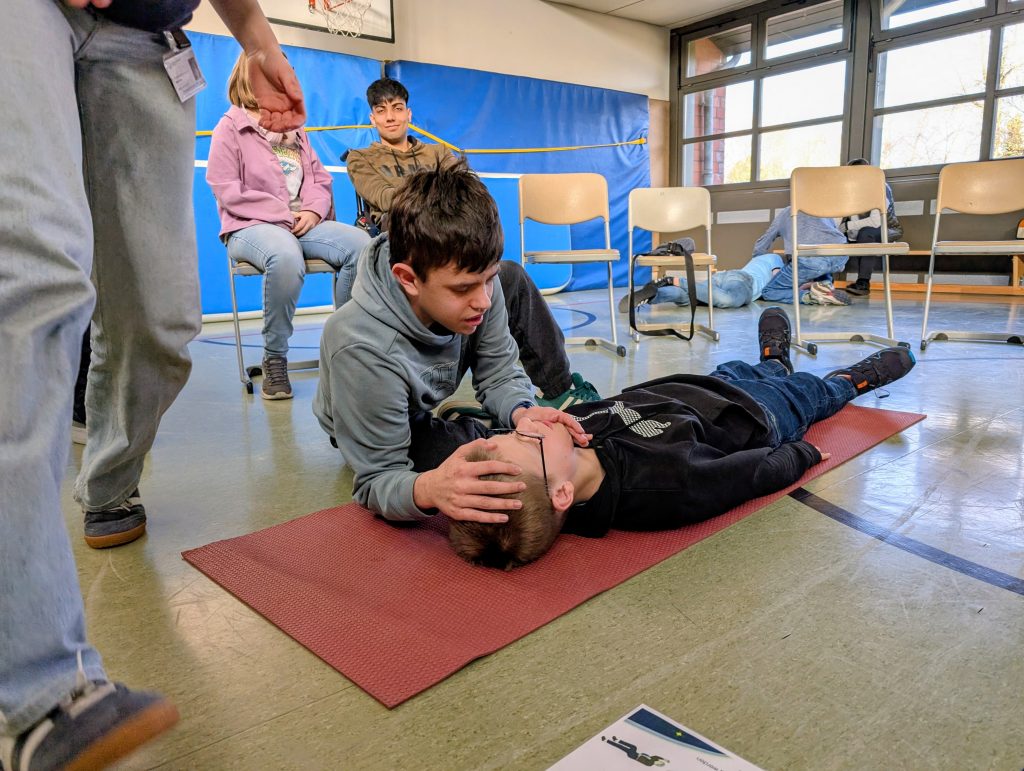 Am 09.03.2026 haben fast 20 Schülerinnen und Schüler einen Erste-Hilfe- Kurs in unserer Schule gemacht. Dabei wurde kräftig geübt, wie man Wunden verbindet, Bewusstlose lagert sowie reanimiert und wie man ein AED-Gerät bedient. Dank sehr guter Anleitung durch eine Mitarbeiterin der Sanitätsschule Oliver Blake konnten die Kinder den Vormittag nutzen, um viele Fragen zu stellen, ihre Neugier zu diesem Thema zu stillen, ihr Vorwissen auszubauen und mehr Sicherheit darin zu erlangen, dass auch sie im Notfall fähig sind zu helfen.